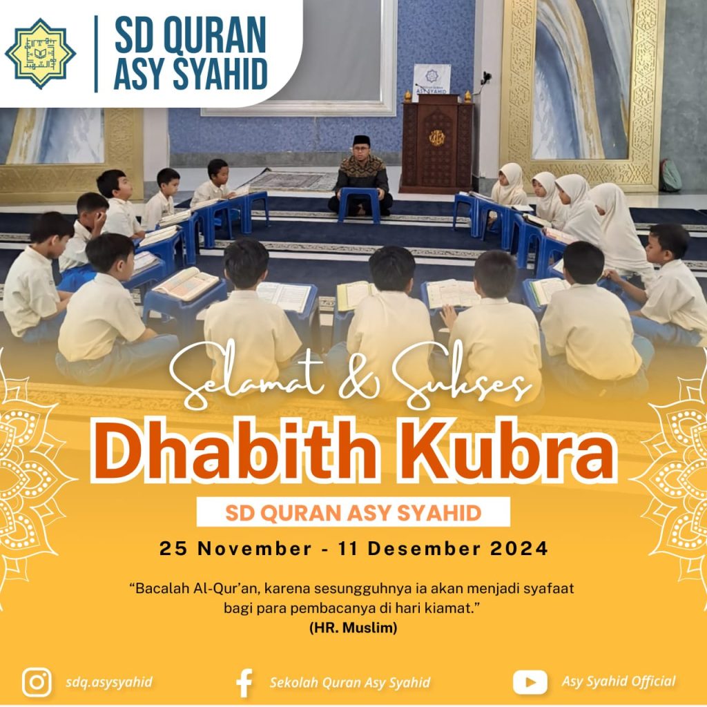 Sehubungan dengan hal tersebut kegiatan Dhabith Kubra (Tahfizh & Tahsin) ananda kelas I – VI akan dilaksanakan pada tanggal 25 November sd. 11 Desember 2024.