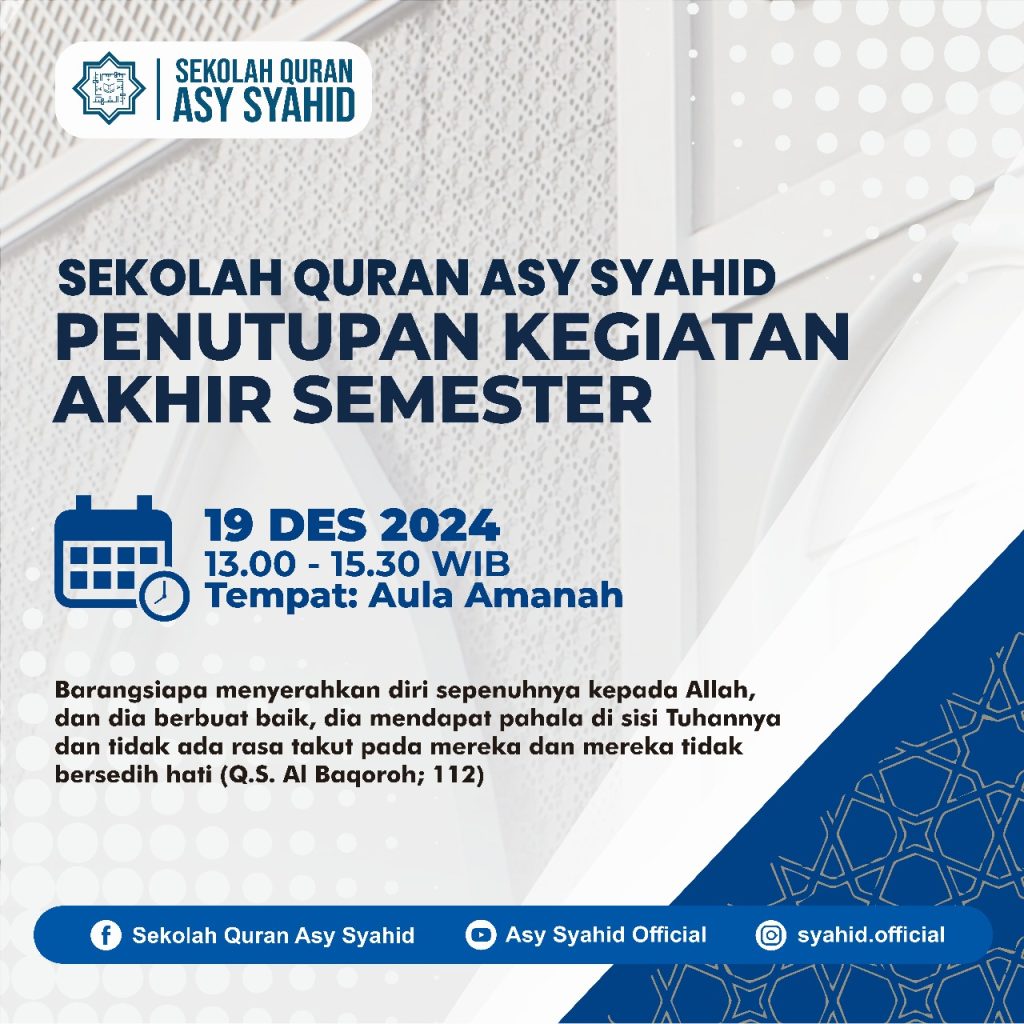 Alhamdulillah seluruh rangkaian kegiatan pembelajaran di semester I telah berakhir. Untuk menutup kegiatan semester I ini, insyaa Allah akan diselenggarakan Kegiatan Penutupan Akhir Semester I TP 2024-2025 pada :