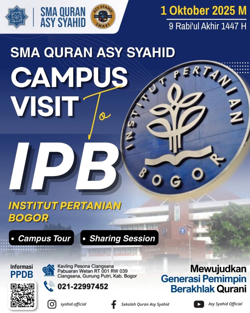 Bogor, 09 September 2025 – Dalam upaya memberikan wawasan lebih luas tentang dunia perguruan tinggi kepada siswa, SMA Quran Asy Syahid akan mengadakan kunjungan akademik ke IPB University dalam program IPB Campus Visit pada 01 Oktober 2025. Kegiatan ini akan diikuti oleh 27 siswa yang antusias untuk mengenal lebih dekat lingkungan akademik serta berbagai program studi yang ditawarkan oleh IPB University.