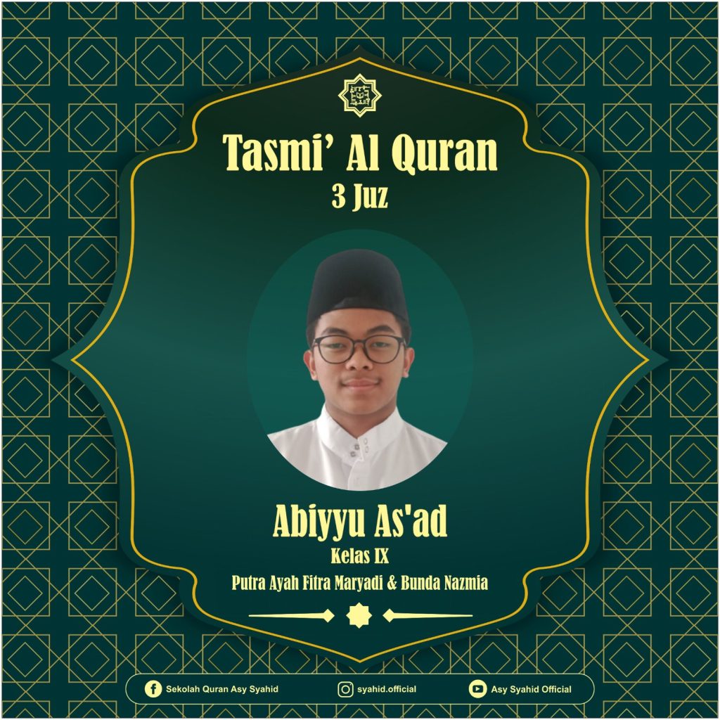 Alhamdulillah dengan penuh rasa syukur ananda Abiyyu As’ad telah menyelesaikan hafalan 3 juz, lulus ujian pra tasmi’ dan MHQ. Insya Allah ananda akan mentasmi’kan seluruh hafalannya pada :