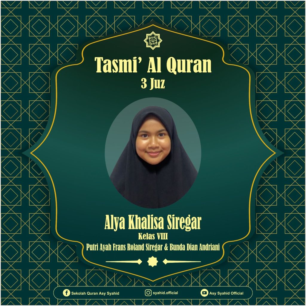 Alhamdulillah dengan penuh rasa syukur ananda Alya Khalisa Siregar telah lulus pra tasmi, lulus MHQ 3 Juz dan telah mentasmikan seluruh hafalannya pada :