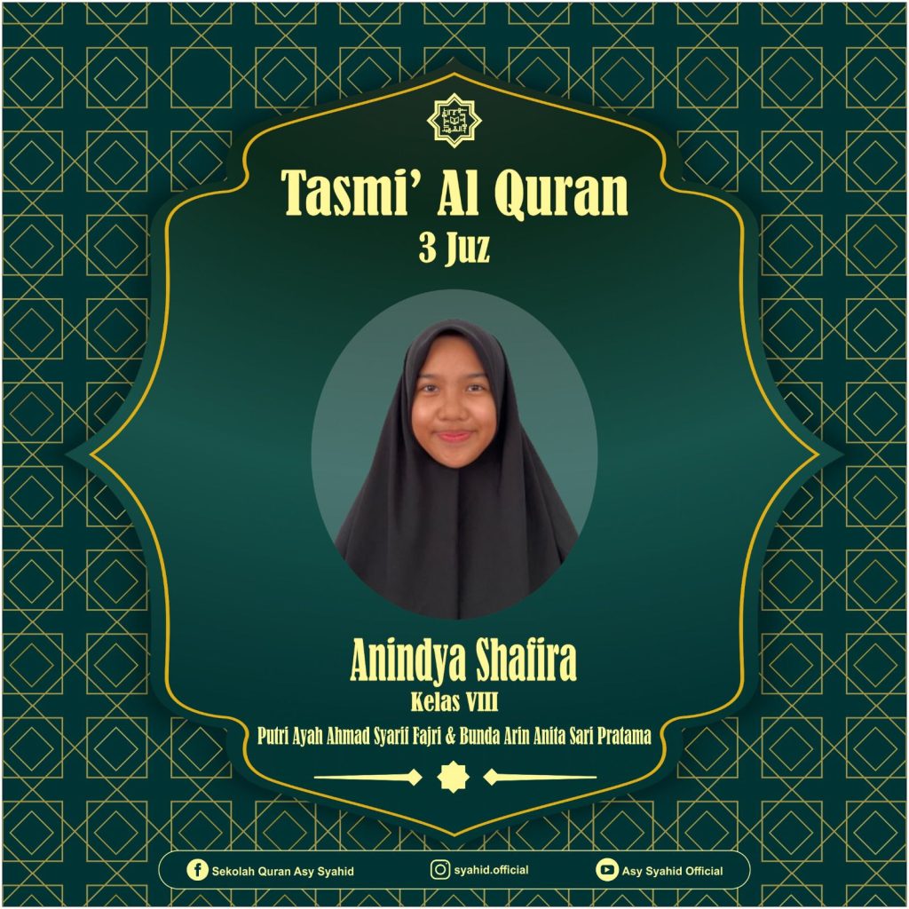 Alhamdulillah dengan penuh rasa syukur ananda Anindya Shafira telah lulus pra tasmi, lulus MHQ 3 Juz dan telah mentasmikan seluruh hafalannya pada :