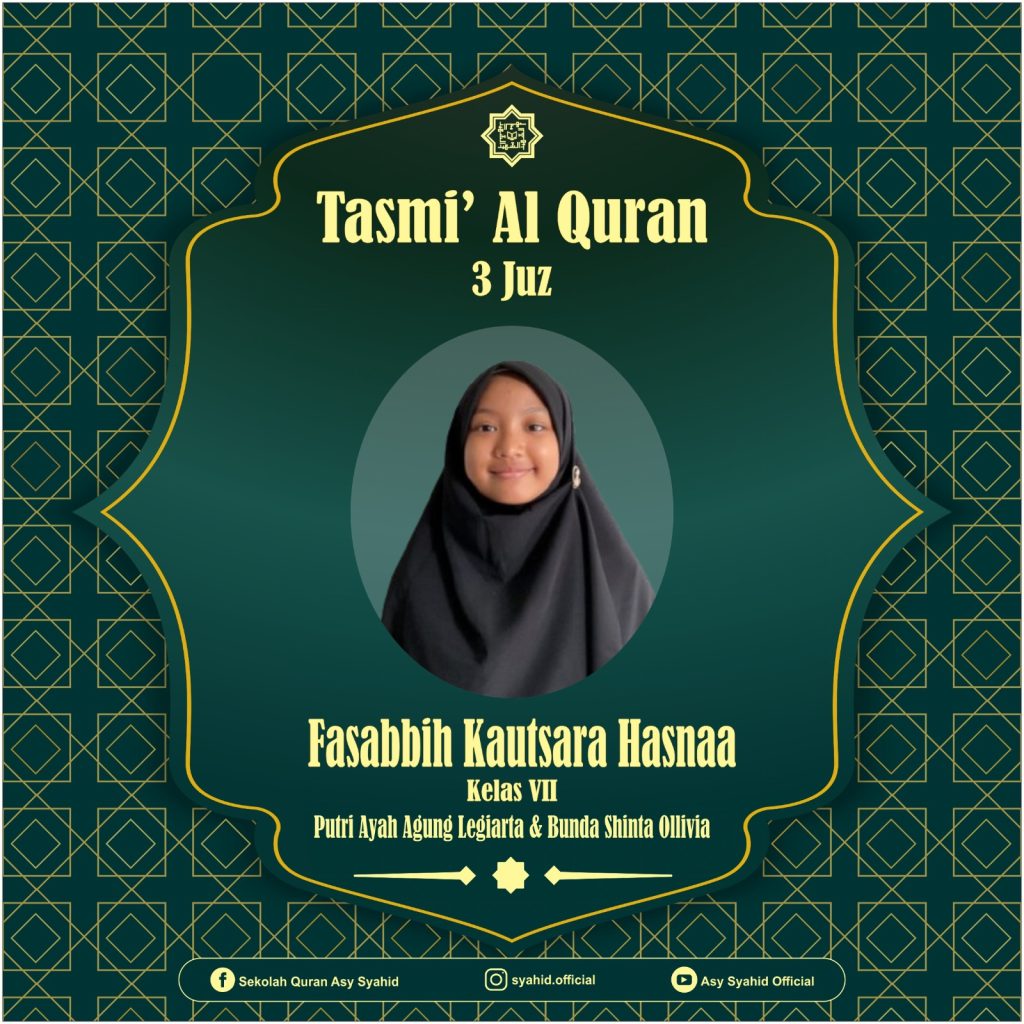 Alhamdulillah dengan penuh rasa syukur ananda Fasabbih Kautsara Hasnaa telah lulus pra tasmi, lulus MHQ 3 Juz dan telah mentasmikan seluruh hafalannya pada :