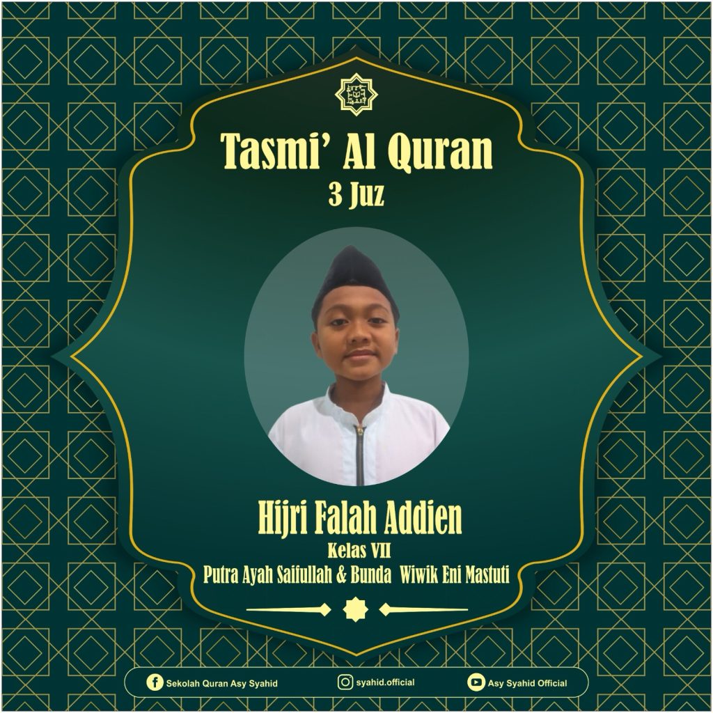Alhamdulillah dengan penuh rasa syukur ananda Hijri Falah Addien telah lulus pra tasmi, lulus MHQ 3 Juz (Juz 30,29,1) dan telah mentasmikan seluruh hafalannya pada :
