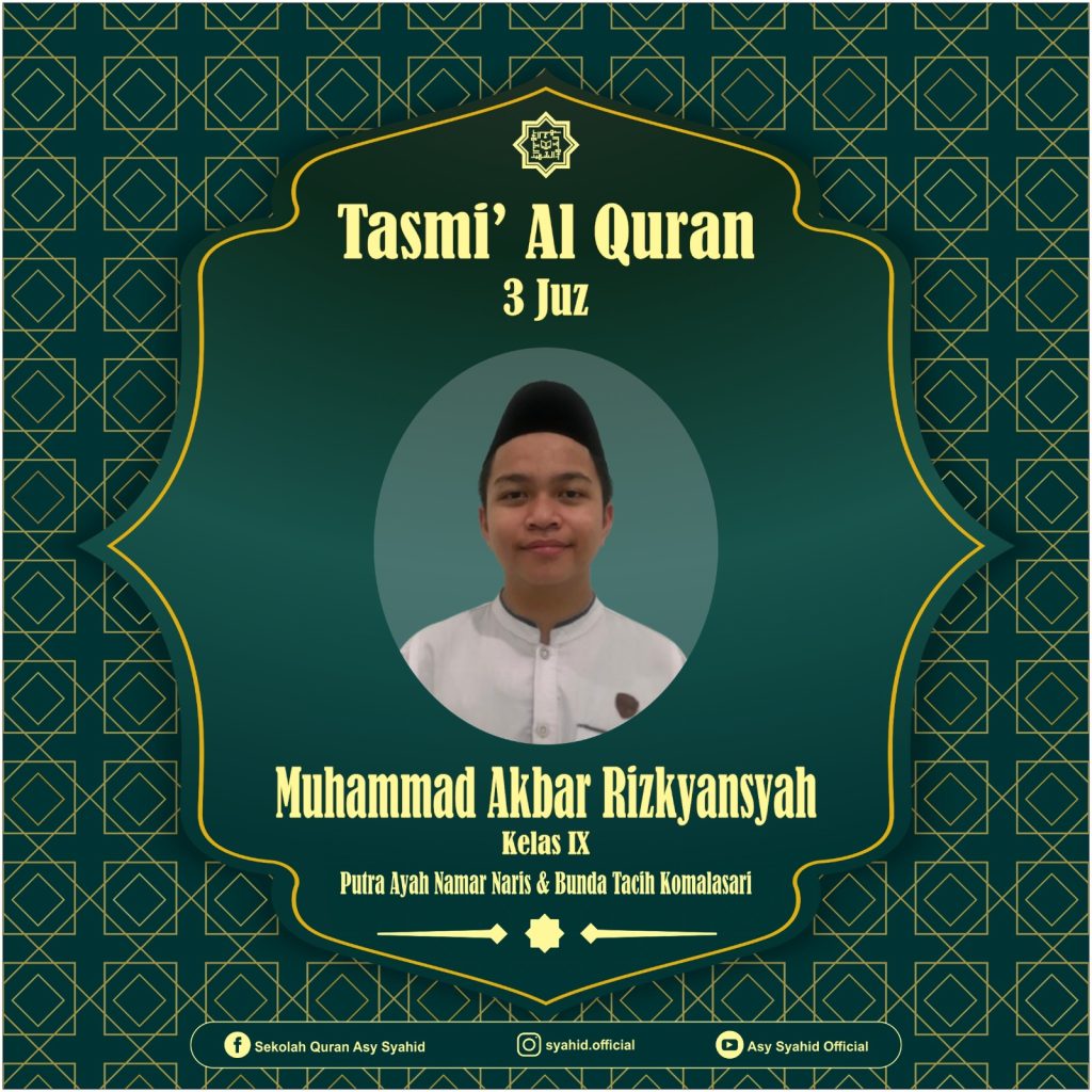 Alhamdulillah dengan penuh rasa syukur ananda Muhammad Akbar Rizkiyansya telah lulus pra tasmi, lulus MHQ 3 Juz dan telah mentasmikan seluruh hafalannya pada :