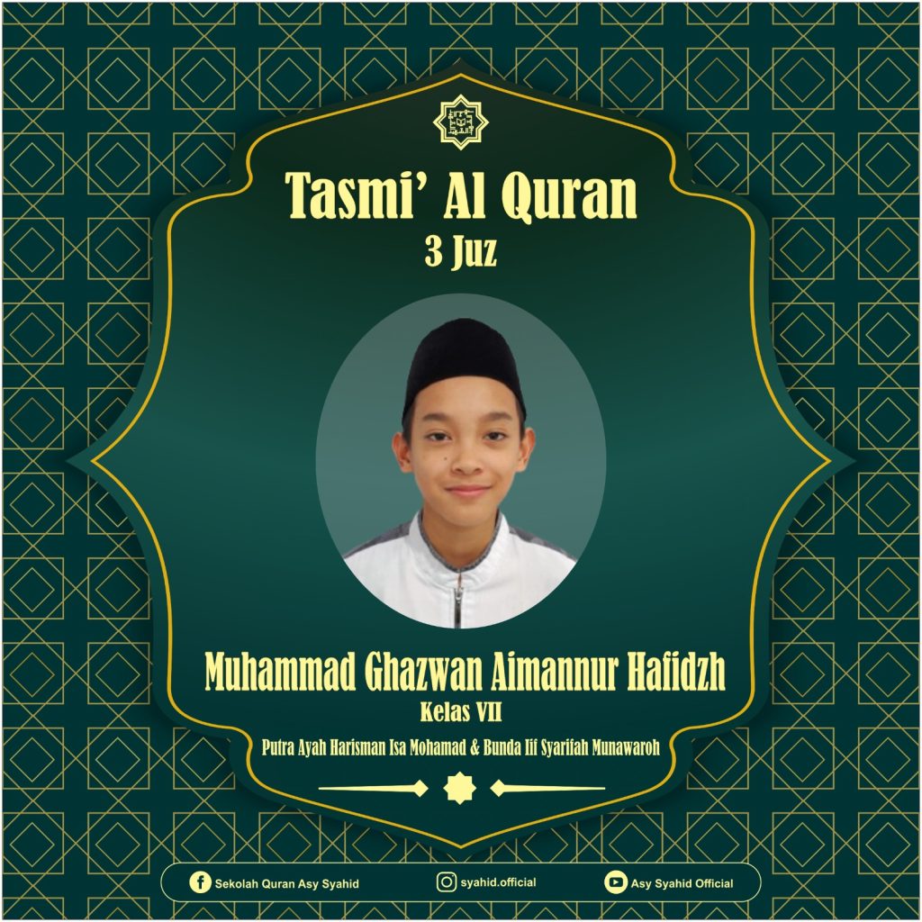 Alhamdulillah dengan penuh rasa syukur ananda Muhammad Ghazwan Hafidzh Aimannur telah lulus pra tasmi, lulus MHQ 3 Juz (Juz 28,29,30) dan telah mentasmikan seluruh hafalannya pada :
