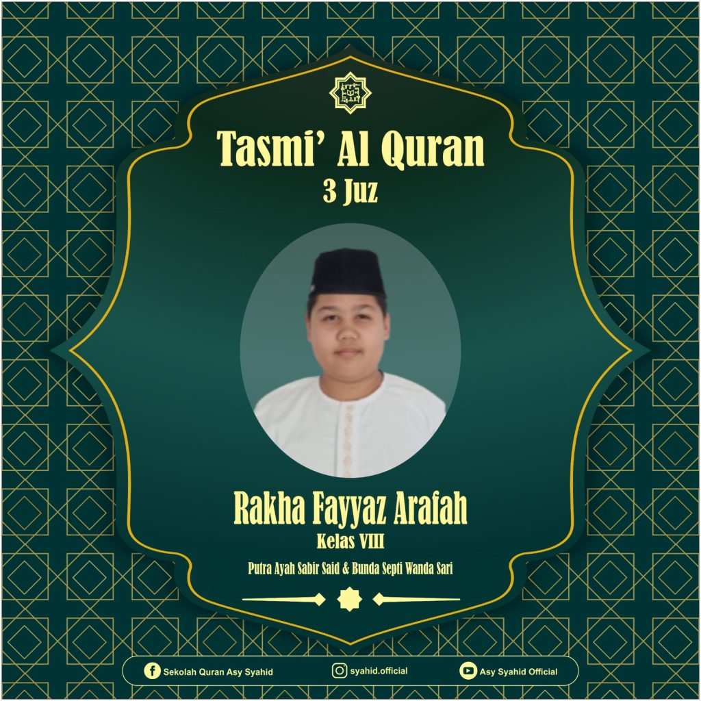 Alhamdulillah dengan penuh rasa syukur ananda Rakha Fayyaz Arafah telah menyelesaikan hafalan 3 juz, lulus ujian pra tasmi’ dan MHQ. Insya Allah ananda akan mentasmi’kan seluruh hafalannya pada :
