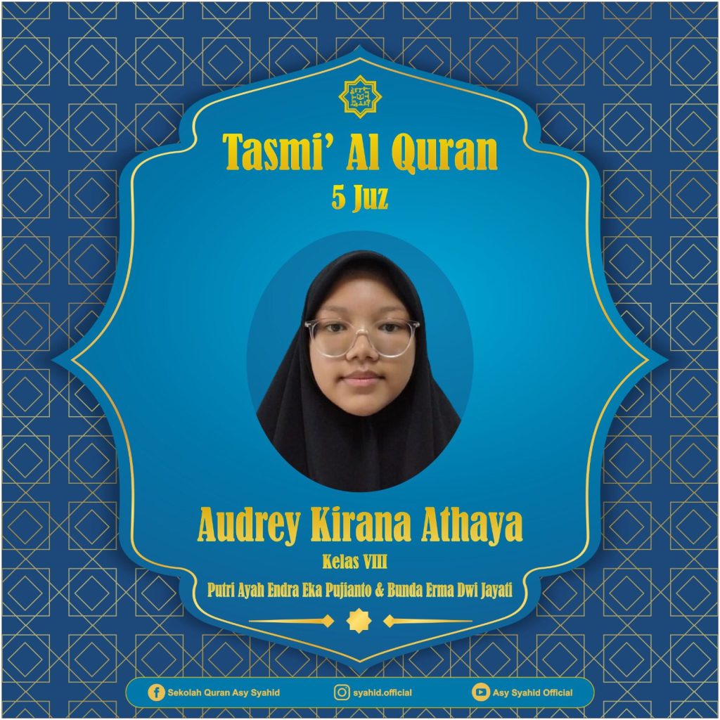Alhamdulillah dengan penuh rasa syukur ananda Audrey Kirana Athaya telah menyelesaikan hafalan 5 juz, lulus ujian pra tasmi’ dan MHQ. Insya Allah ananda akan mentasmi’kan seluruh hafalannya pada :