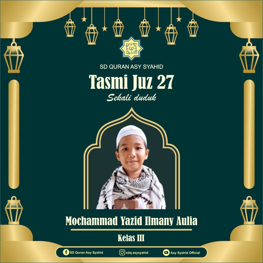 Alhamdulillah, Ananda Mochammad Yazid Ilmany Aulia dari kelas lII SD Quran Asy Syahid telah menyelesaikan setoran hafalan juz 27 dan akan di tasmikan dengan sekali duduk, pada :